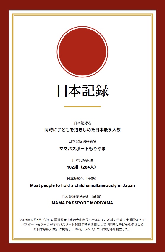 ママパスポート設立まもなく10周年を記念して、2025年12月5日に開催したママパスマルシェ内プログラム「同時に子どもを抱きしめた日本最多人数」のタイトルに102組の親子が参加してくれ、見事日本記録として認定されました。